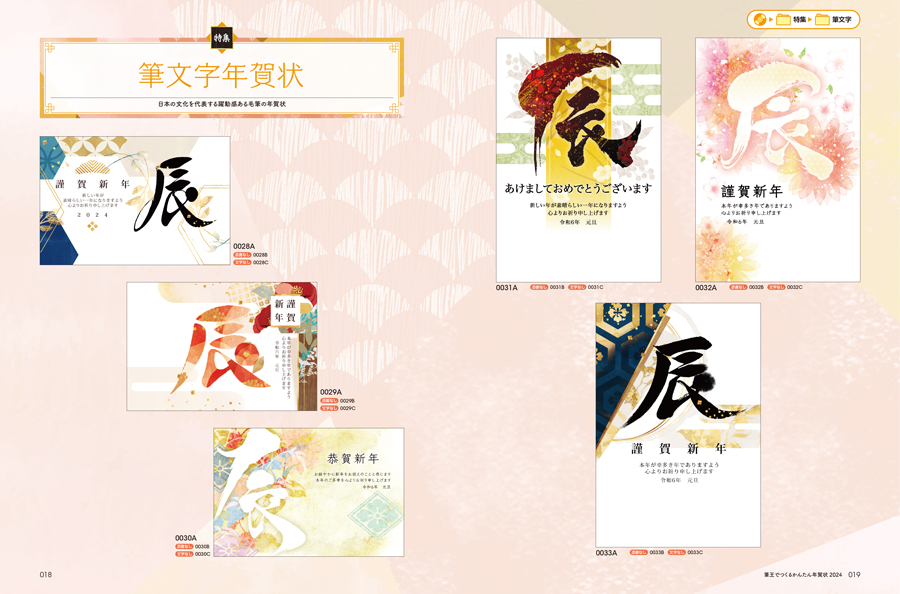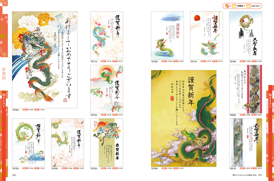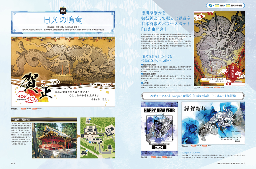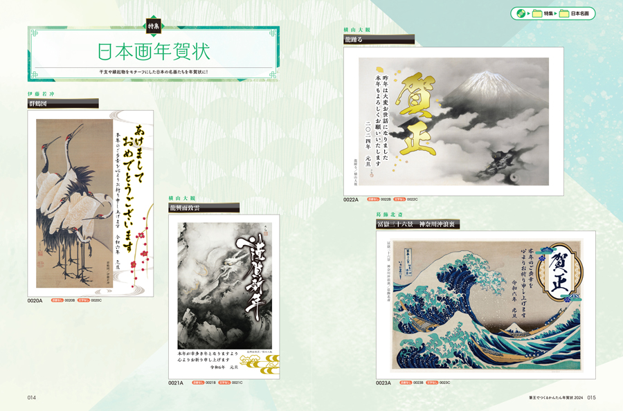 辰年ならではの横山大観「龍興而致雲」をはじめ、葛飾北斎、伊藤若冲などの落ち着きのある日本画デザイン。誰もが目にしたことのある有名な天井画をモチーフに、写真や軽やかなイラスト化した「日光の鳴竜」。和モダンで、スタイリッシュな渋さを醸し出す「筆文字」。