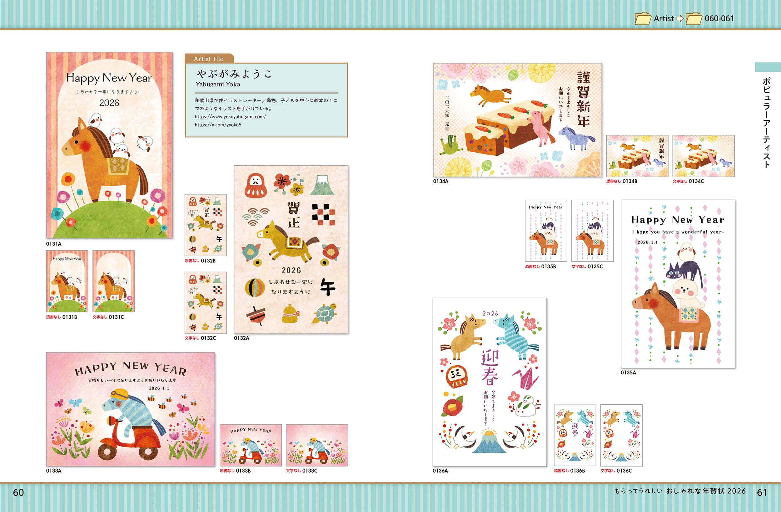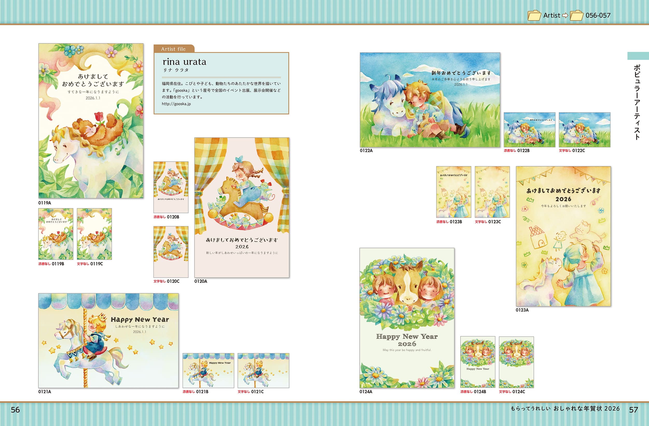 オオジカオリ、灯さかすといった人気のイラストレーターやデザイナーによるおしゃれな年賀状を収録。