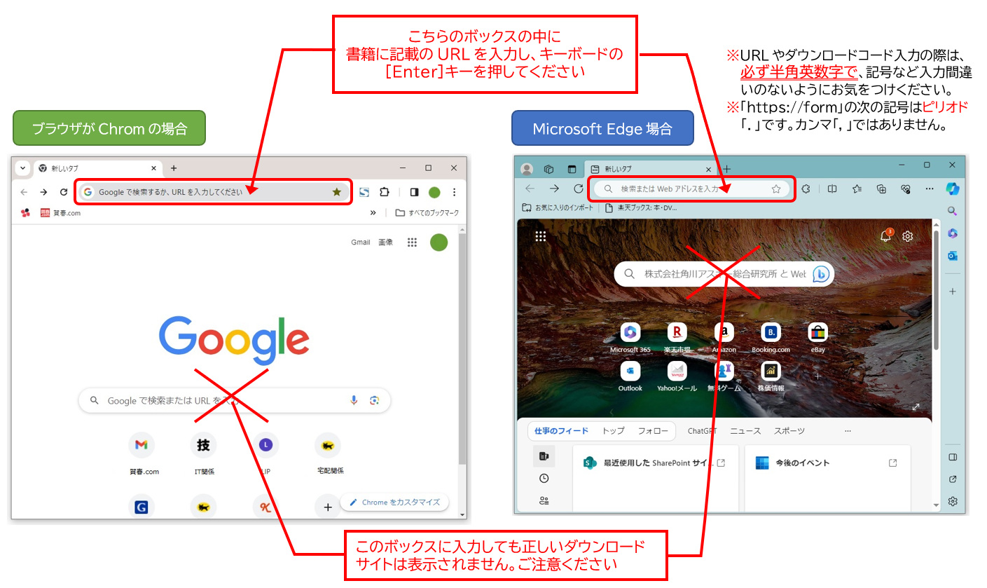 素材とソフトをダウンロードするには、書籍P.2「本書収録の素材データとソフトウェアのダウンロードについて」に記載されているURLをWebブラウザの「アドレスバー」に入力してください。「アドレスバー」の場所は下図をご覧ください(※クリックすると拡大表示します)。