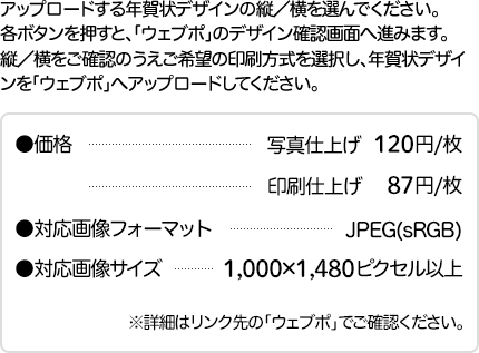 アップロードする年賀状デザインの縦/横を選んでください。 各ボタンを押すと、「ウェブポ」のデザイン確認画面へ進みます。 縦/横をご確認のうえご希望の印刷方式を選択し、年賀状デザインを「ウェブポ」へアップロードしてください。