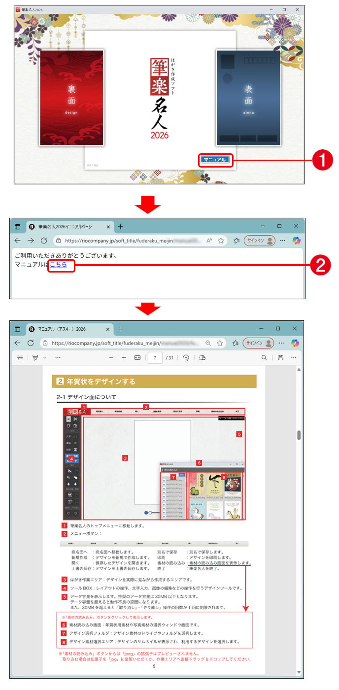 筆楽名人には、オンラインマニュアルが用意されています。以下の方法で表示することができます。なお、オンラインマニュアルを見るには、インターネットの接続環境が必要です。
